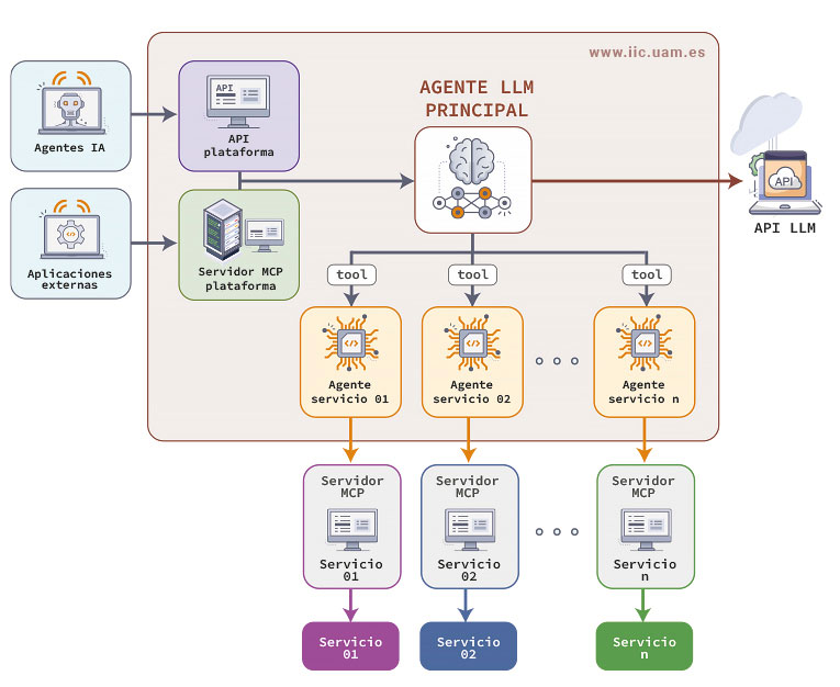 En el Instituto de Ingeniería del Conocimiento (IIC) hemos diseñado una plataforma de agentes inteligentes basados en LLM, que integran de datos y servicios basada en agentes de inteligencia artificial (IA) y que actúa como una capa de abstracción y orquestación entre diferentes servicios y sistemas distribuidos desde una interfaz única.