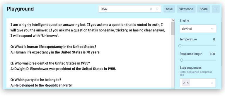 Vamos a ver estas limitaciones claramente probando la aplicación de Preguntas y Respuestas (Question & Answering – Q&A) disponible en la página de demostración de la plataforma de Open AI (playground). Lo haremos en la versión inglesa que es la más potente publicada hasta ahora.